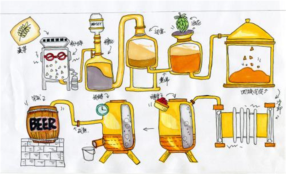 麥芽在送入釀造車間之前,先被送到粉碎塔在這里,麥芽經過輕壓粉碎制成釀造用麥芽糊化處理即將粉碎的麥芽/谷粒與水在糊化鍋中混合。糊化鍋是一個巨大的回旋金屬容器,裝有熱水與蒸汽入口,攪拌裝置如攪拌棒、攪拌槳或螺旋槳,以及大量的溫度與控制裝置。在糊化鍋中,麥芽和水經加熱后沸騰,這是天然酸將難溶性的淀粉和蛋白質轉變成為可溶性的麥芽提取物,稱作麥芽汁。然后麥芽汁被送至稱作分離塔的濾過容器。麥芽汁在被泵入煮沸鍋之前需先在過濾槽中去除其中的麥芽皮殼,并加入酒花和糖。煮沸:在煮沸鍋中,混合物被煮沸以吸取酒花的味道,并起色和消毒。在煮沸后加入酒花的麥芽汁被泵入回旋沉淀槽以去處不需要的酒花剩余物和不溶性的蛋白質。