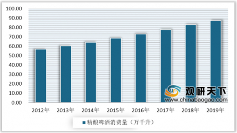 近年來中國啤酒產量持續下滑,而中高端啤酒消費則持續增長,推動了精釀啤酒市場發展。數據顯示,2018年中國精釀啤酒消費量在82.9萬千升左右,占啤酒消費量的2.1%,2019年中國精釀啤酒消費量為87.3萬千升,約占啤酒消費量的2.4%。