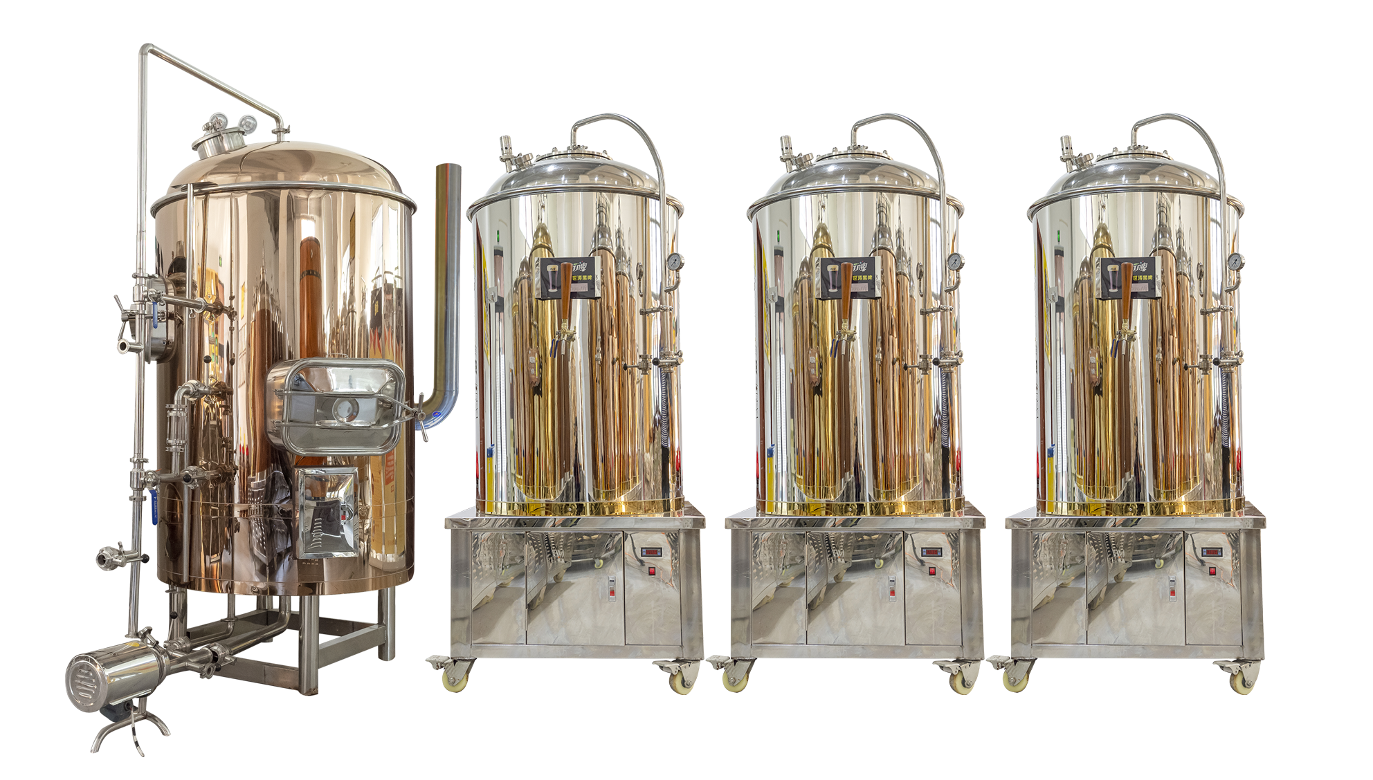 一體機顧名思義,一體化釀造設(shè)備,即糖化過濾煮沸漩沉都在一個設(shè)備里完成,占地面積小。該設(shè)備在業(yè)內(nèi)俗稱一體機,也叫一拖幾(這里“幾”是發(fā)酵罐的數(shù)量,常見的有一拖三、一拖四、一拖六等,即配備三個發(fā)酵罐、四個發(fā)酵罐、六個發(fā)酵罐)。市面常見的一體機分為上下兩層,上層糖化過濾,下層煮沸漩沉,加熱方式以電加熱為主。發(fā)酵罐也進(jìn)行了改變,不帶60度大錐角,每個發(fā)酵罐帶一個小制冷機來取代獨立的冰水罐和配套的制冷劑。大部分也不再配套板式換熱器,麥汁糖化完成后進(jìn)發(fā)酵罐后再進(jìn)行冷卻。